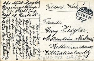 Feldpostkarte vom 17. März 1916 an Familie Ziegler in Mannheim-Neckarau. Auf der Vorderseite: Schwarz-weiß Aufnahme von Rastatt vom Fluss Murg aus gesehen. Auf der Rückseite: Poststempel aus Rastatt, handschriftliches Grußwort.