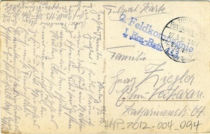 Feldpostkarte vom 25. März 1916 an Familie Ziegler in Mannheim-Neckarau. Auf der Vorderseite: Kolorierte Abbildung des Schlosses in Mühlheim im Donautal. Auf der Rückseite: Stempel der 2. Feldkompagnie - 1. Ersatz-Bataillon 113, Stempel des Truppenübungsplatzes Heuberg Koblenz, handschriftliches Grußwort.