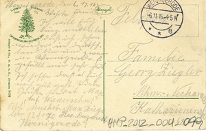 Feldpostkarte vom 6. November 1916 an Familie Ziegler in Mannheim-Neckarau. Auf der Vorderseite: Schwarz-weiß Aufnahme des Brockenhotels im Harz. Auf der Rückseite: Poststempel aus Wernigerode, handschriftliches Grußwort.