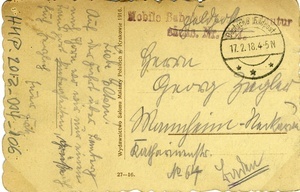 Feldpostkarte vom 17. Februar 1918 an Georg Ziegler in Mannheim-Neckarau; Vorderseite: Schwarz-weiß Aufnahme mit der Beschriftung "Lwow. Ulica Kademicka i gmach izby handlowej. - Lemberg. Akademische Straße und Handelskammer"; Rückseite: Zwei Feldpoststepel, handschriftliches Grußwort.