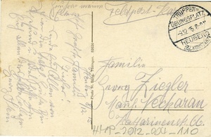 Feldpostkarte vom 8. Dezember 1915 an Familie Ziegler in Mannheim-Neckarau. Auf der Vorderseite: Kolorierte Ansicht des Schlosses Bronnen im Donautal. Auf der Rückseite: Stempel des Truppenübungsplatzes Heuberg Konstanz, handschriftliches Grußwort.