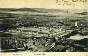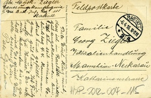 Feldpostkarte vom 6. April 1916 an Familie Ziegler in Mannheim-Neckarau. Auf der Vorderseite: Schwarz-weiß Luftaufnahme der Kaserne 111 in Rastatt mit handschriftlichem Verweis auf ein Gebäudeteil "In diesem Bau liege ich. (Festung)". Auf der Rückseite: Poststempel von Rastatt, handschriftliches Grußwort.