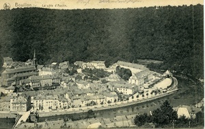 Feldpostkarte vom 29. Mai 1916 an Friedrich Ziegler in Mannheim-Neckarau. Auf der Vorderseite: Schwarz-weiß Luftaufnahme von Bouillon. Auf der Rückseite: 2 Poststempel, handschriftliches Grußwort.