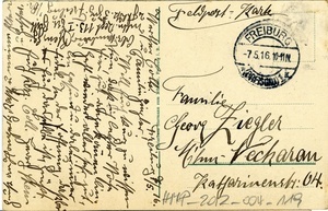 Feldpostkarte vom 7. Mai 1916 an Familie Ziegler in Mannheim-Neckarau. Auf der Vorderseite: Schwarz-weiß Aufnahme des Realgymnasiums in Freiburg im Breisgau. Auf der Rückseite: Poststempel von Freiburg, handschriftliches Grußwort.