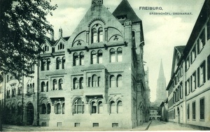 Feldpostkarte vom 22. November 1915 an Familie Ziegler in Mannheim-Neckarau. Auf der Vorderseite: Schwarz-weiß Aufnahme des Erzbischöflichen Ordinariats in Freiburg. Auf der Rückseite: Poststempel von Freiburg im Breisgau, handschriftliches Grußwort.