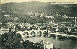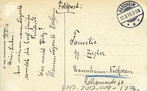 Feldpostkarte vom 10. März 1916 an Familie Ziegler in Mannheim-Neckarau. Auf der Vorderseite: Schwarz-weiß Aufnahme von Heidelberg vom Philosophenweg aus in Richtung Altstadt. Auf der Rückseite: Poststempel von Hardheim, handschriftliches Grußwort.