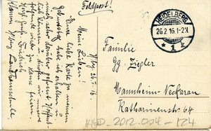 Feldpostkarte vom 26. Februar 1916 an Familie Ziegler in Mannheim-Neckarau. Auf der Vorderseite: Kolorierte Ansicht von Heidelberg "Blick v. d. Molkenkur auf die Zieglehäuserlandstrasse". Auf der Rückseite: Poststempel aus Heidelberg, handschriftliches Grußwort.