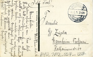 Feldpostkarte vom 12. Juni 1916 an Familie Ziegler in Mannheim-Neckarau. Auf der Vorderseite: Schwarz-weiß Ansicht des sogenannten "Blauen Huts" in Weinheim. Auf der Rückseite: Poststempel von Weinheim a. d. Bergstraße, handschriftliches Grußwort.