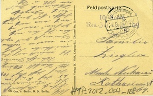 Feldpostkarte vom 1. September 1916 (?) an Familie Ziegler in Mannheim-Neckarau. Auf der Vorderseite: Schwarz-weiß Aufnahme einer Straße von St. Souplet in Frankreich. Auf der Rückseite: Feldpoststempel, handschriftliches Grußwort.