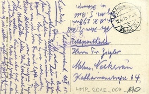 Feldpostkarte vom 10. Oktober 1915 an Friedrich Ziegler in Mannheim-Neckarau. Auf der Vorderseite: Schwarz-weiß Aufnahme der zerstörten Kapelle Notre Dame de Loretto. Auf der Rückseite: Feldpoststempel, handschriftliches Grußwort.