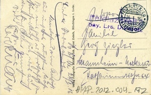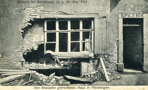 Feldpostkarte vom 26. Januar 1916 an Georg Ziegler in Mannheim-Neckarau. Auf der Vorderseite: Schwarz-weiß Aufnahme eines von Granaten getroffenen Hauses in Mörchingen nach der Schlacht von Mörchingen am 19. und 20. August 1914. Auf der Rückseite: Feldpoststempel, Stempel des Feldlazaretts der bayerischen Ersatz-Division, handschriftliches Grußwort.