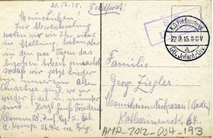 Feldpostkarte vom 22. September 1915 an Familie Ziegler in Mannheim-Neckarau. Auf der Vorderseite: Schwarz-weiß Aufnahme der Mühle in Domêvre. Auf der Rückseite: Feldpoststempel, handschriftliches Grußwort.