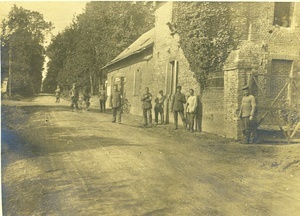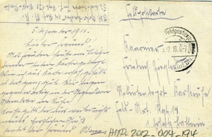 Feldpostkarte vom 5. Dezember 1916 an Friedrich Ziegler. Auf der Vorderseite: Schwarz-weiß Aufnahme von Soldaten auf einer Dorfstraße. Auf der Rückseite: Feldpoststempel, handschriftliches Grußwort.