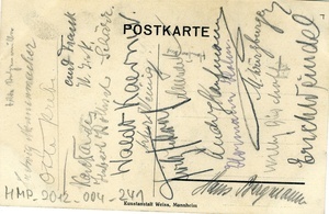 Ungelaufene und unbeschriebene Postkarte zum "Kriegsabitur Realgymnasium I 1916". Abgebildet ist eine Zeichnung einer Medaille an einem schwarz-weiß-gelben Band. Die Medaille zeigt ein aufgeklapptes Buch, auf dem links eine Pickelhaube und rechts eine Schirmmütze liegen. Ein Lorbeer-Ornament umrandet das Buch. Die Zeichnung ist signiert mit "F.M. 16". Auf der Rückseite wurden Unterschriften gesammelt.