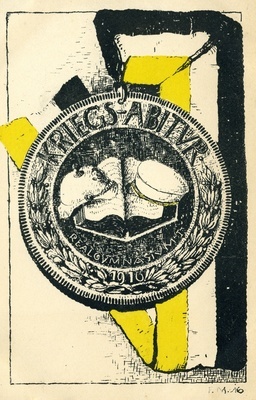 Ungelaufene und unbeschriebene Postkarte zum "Kriegsabitur Realgymnasium I 1916". Abgebildet ist eine Zeichnung einer Medaille an einem schwarz-weiß-gelben Band. Die Medaille zeigt ein aufgeklapptes Buch, auf dem links eine Pickelhaube und rechts eine Schirmmütze liegen. Ein Lorbeer-Ornament umrandet das Buch. Die Zeichnung ist signiert mit "F.M. 16". Auf der Rückseite wurden Unterschriften gesammelt.