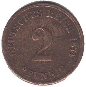 Der Avers zeigt die Wertzahl "2" des Nominals, umgeben von der Nominaleinheit "PFENNIG", der Jahreszahl und dem Landesnamen "DEUTSCHES REICH". Das Wort "PFENNIG" wird von zwei Punkten eingefasst. Auf dem Revers befindet sich der kleine, gekrönte Reichsadler mit preußischem Wappenadler auf der Brust. Rechts und links neben dem Schwanz des Adlers wird das Kürzel der Prägestätte dargestellt. Der Rand ist glatt. Durch Bodenlagerung ist die Münze stark korrodiert und abgenutzt.