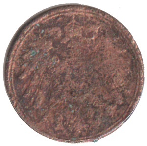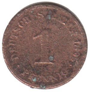 Der Avers zeigt die Wertzahl "1" des Nominals, umgeben von der Nominaleinheit "PFENNIG", der Jahreszahl und dem Landesnamen "DEUTSCHES REICH". Das Wort "PFENNIG" wird von zwei Punkten eingefasst. Auf dem Revers befindet sich der kleine, gekrönte Reichsadler mit preußischem Wappenadler auf der Brust. Rechts und links neben dem Schwanz des Adlers wird das Kürzel der Prägestätte dargestellt. Durch Bodenlagerung ist die Münze stark korrodiert und abgenutzt.