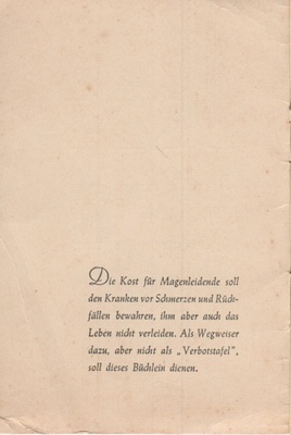 Heft des Kur- und Badearztes Dr. A. Peters in Bodendorf mit einer Diät-Anleitung für eine Magenschonkost. Auf sieben Seiten werden die Grundregeln und spezielle Anweisungen zu Gerichten gegeben, wie Suppen, Gemüse und Salate, Fleisch und Wurstwaren, Fisch und Schalentiere, Obst, Milch, Butter, Käse, Eier, Brot und Bebäck, Mehlspeisen und Konditorwaren und auch Getränken, die einzuhalten sind. Das letzte Blatt ist herausgelöst; es enthielt persönliche Daten des Patienten. Auf der Rückseite ist Platz für die Eintragung von "Besondere Anordnung des Arztes".