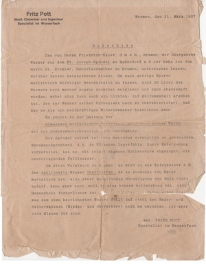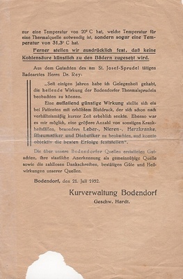 Auf drei Seiten beschreibt die Kurverwaltung Bodendorf die Vorzüge des St. Josef-Sprudel ind Bodendorf. Im ersten Kapitel wird auf eine Aufklärungsaktion der Neuenahrer Kurdirektion hingewiesen. In dieser würde man sich auf Quellen benachbarter Orte beziehen. Angeführt wird, dass in dieser Druckschrift nicht auf die Bodendorfer Quelle eingegangen würde. In der folgenden Zwischenüberschrift "Der Bodendorfer St. Josef-Sprudel ist eine staatlich anerhannnte Heilquelle" verweist die Bodendorfer Kurverwalrung auf ein Gutachten von Prof. Kionka, Jena, und eine Wasseranalyse von Prof. Keller, Jena, und beschreibt auf Seite 2 und 3 das Gutachten und die Analyse mit den Vorzügen des Heilwassers. Aus der Druckschrift ist im unteren Teil ein Teil des Blattes herausgerissen.