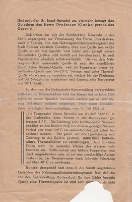 Auf drei Seiten beschreibt die Kurverwaltung Bodendorf die Vorzüge des St. Josef-Sprudel ind Bodendorf. Im ersten Kapitel wird auf eine Aufklärungsaktion der Neuenahrer Kurdirektion hingewiesen. In dieser würde man sich auf Quellen benachbarter Orte beziehen. Angeführt wird, dass in dieser Druckschrift nicht auf die Bodendorfer Quelle eingegangen würde. In der folgenden Zwischenüberschrift "Der Bodendorfer St. Josef-Sprudel ist eine staatlich anerhannnte Heilquelle" verweist die Bodendorfer Kurverwalrung auf ein Gutachten von Prof. Kionka, Jena, und eine Wasseranalyse von Prof. Keller, Jena, und beschreibt auf Seite 2 und 3 das Gutachten und die Analyse mit den Vorzügen des Heilwassers. Aus der Druckschrift ist im unteren Teil ein Teil des Blattes herausgerissen.