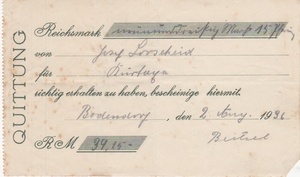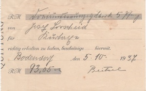 Empfangsbescheinigung über die Einzahlung der Kurtaxen an die Gemeinde Oktober 1938