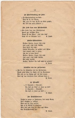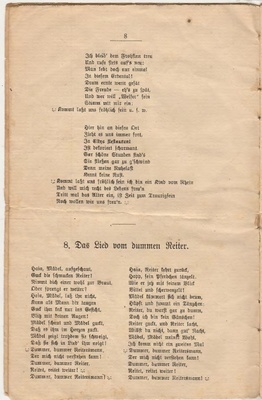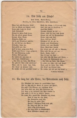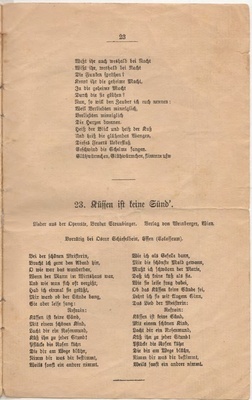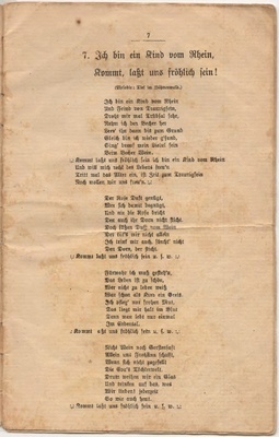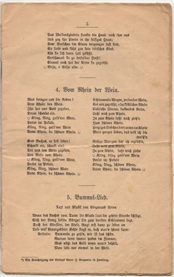 Heft ist ohne Umschlagseite und die Seiten 2 und 3 fehlen. Der Inhalt besteht aus einem Trinkspruch und Texte zu patriotisch nationalem Liedgut, wie "Däm Schmitz sein Frau es widder doh!", "Bilja-Lied", "Vom Rhein der Wein", "Bummel-Lied", "Sei gegrüßt mein schönes Sorrent", "Ich bin ein Kind vom Rhein, kommt, laßt uns fröhlich sein", "Das Lied vom dummen Reiter.", "Geh´n wir noch in´s Café?", "Laßt und das Leben genießen.", "Oh du mein Büffelchen.", "Grüß Gott, alle miteinander.", "Der Mai ist gekommen.", "Geh, mach Dei Fensterl auf.", "Wer nit fruh es, dann un wann!", "Die Meistersinger von Berlin.", "Pfeiflied", "Laßt den Kopf nicht hängen.", "Berliner Luft.", "Willst du mein Cousinchen sein?", "Schaufel-Lied", Glühwürmchen-Idyll.", "Küssen ist keine Sünde.", "Bis früh ums Fünfe!" und "So lang der alte Peter, der Petersturm noch steht".