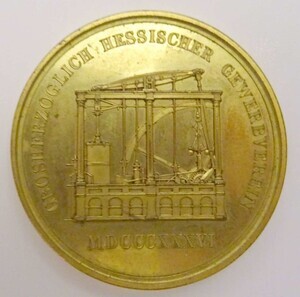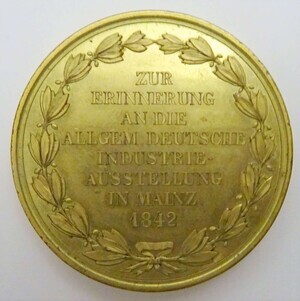 Im September und Oktober 1842 fand im Deutschhaus, dem heutigen rheinland-pfälzischen Landtag, die Erste Deutsche Industrie Ausstellung statt. Auf der Medaille ist folgender Text angegeben: VS: Rundumschrift "Großherzoglich Hessischer Gewerbeverein, MDCCCXXXVI (röm. 1836) und Abbildung einer Dampfmaschine, RS: Mehrzeiler "Zur Erinnerung an die Allgem. Industrieausstellung in Mainz 1842, umkränzt von einem Lorbeerkranz.