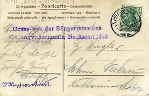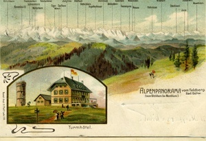 Kolorierte Postkarte vom 27. Mai 1912 aus dem Hochschwarzwald an Georg Ziegler in Mannheim-Neckarau. auf der Vorderseite: Kolorierte Ansicht des Alpenpanoramas vom Feldberg aus, Ansicht des Turmhotels. Auf der Rückseite: Briefmarke, Poststempel vom 27. Mai 1912 vom Feldberg im Hochschwarzwald, Beschriftung mit Schreibmaschine: "Gruss von der Sängerreise des Gesangv: Germania Neckarau. 1912" und ein handschriftliches Grußwort.