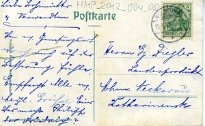 Kolorierte Postkarte vom 15. August 1912 aus Sulzburg an Georg Ziegler in Mannheim-Neckarau. Auf der Vorderseite: Ansicht von Bad Sulzburg und dem Genesungsheim Forsthaus. Auf der Rückseite: Briefmarke, Poststempel vom 15. August 1912 aus Sulzburg und ein handschriftliches Grußwort.