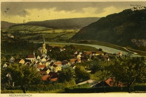Kolorierte Postkarte vom 12. Juni 1914 aus Mannheim an Friedrich Ziegler in Mannheim-Neckarau. Auf der Vorderseite: Ansicht von Neckargerach mit der Minneburg. Auf der Rückseite: Briefmarke, Poststempel vom 12. Juni 1914 und ein handschriftliches Grußwort.