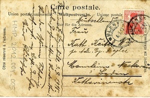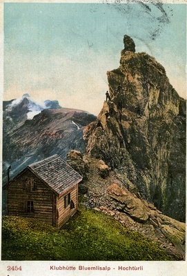 Kolorierte Postkarte vom 6. Oktober 1910 aus Mülenen (?) in der Schweiz an Frau Keitel / Georg Ziegler in Mannheim-Neckarau. Auf der Vorderseite: Ansicht der Klubhütte Bluemlisalp - Hochturli. Auf der Rückseite: Briefmarke, 2 Poststempel vom 6. Oktober 1910, und ein handschriftliches Grußwort.