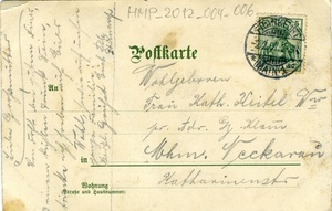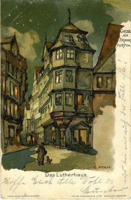 Kolorierte Postkarte vom 2. Februar 1907 aus Frankfurt am Main an Frau Keitel in Mannheim-Neckarau. Auf der Vorderseite: Wiedergabe eines Aquarells von C. Pfaff, Aufschrift: "Gruss aus Frankfurt a/M. / Das Lutherhaus.", teilweise handschriftlich beschriftet. Auf der Rückseite: Briefmarke, Poststempel vom 2. Februar 1907, handschriftliches Grußwort.