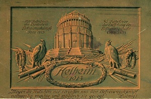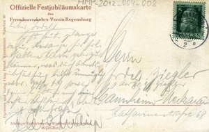 Kolorierte Postkarte vom 31. August 1913 aus Regensburg an Friedrich Ziegler in Mannheim-Neckarau. Auf der Vorderseite: Heroische, militärische Darstellung der Befreiungshalle in Kehlheim, Bayern, Aufschrift: "1813 - 1863 - 1913 / Bayern / Kehlheim. / ’Möchten die Teutschen nie vergessen, was den Befreiungskampf nothwendig machte und wodurch sie gesiegt.’ Ludwig I. R. / 100 Jahrfeier der Deutschen Befreiungskämpfe. 50 Jahrfeier der Eröffnung der Befreiungshalle." Auf der Rückseite: Briefmarke, Poststempel vom 21. August 1913, Aufschrift: "Offizielle Festjubiläumskarte des Fremdenverkehrs-Verein Regensburg", handschriftliches Grußwort.