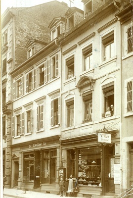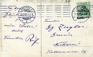 Postkarte vom 30. Dezember 1908 aus Mannheim an Georg Ziegler in Mannheim-Neckarau. Auf der Vorderseite: Schwarz-weiß Fotografie eines Stadthauses, in dem im Erdgeschoss der Graveur V. Ruf angesiedelt ist. auf der Rückseite: Briefmarke, 2 Poststempel vom 30. Dezember 1908, handschriftliches Grußwort zum neuen Jahr von Familie Ruf.