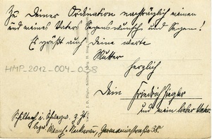 Postkarte an Friedrich Ziegler von seinen Eltern. Auf der Vorderseite: Schwarz-weiß Ansicht von Schiltach mit handschriftlichen Ergänzungen. Auf der Rückseite: Handschriftliches Grußwort.