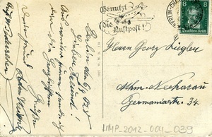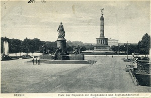 Postkarte vom 6. September 1928 an Georg Ziegler in Mannheim-Neckarau. Auf der Vorderseite: Schwarz-weiß Aufnahme vom "Platz der Republik mit Siegessäule und Bismarckdenkmal" in Berlin. Auf der Rückseite: Briefmarke, Poststempel vom 7. September 1928, Luftpoststempel, handschriftliches Grußwort. Das Bismarck-Nationaldenkmal und die Siegessäule befinden sich heute am nördlichen Rand sowie in der Mitte des Großen Sterns im Großen Tiergarten.
