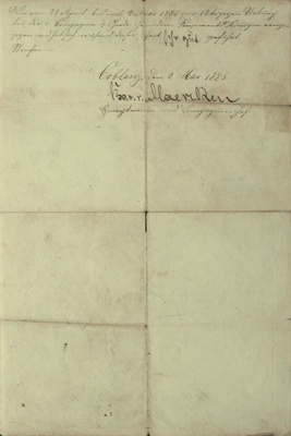 Handgeschriebenes Führungszeugnis auf vorgedruckten Dokument für den Grenadier Peter Josef Beitzel, der in der Zeit vom 21. April bis 2. Mai 1885 eine 12 tägige Übung bei der 6. Companie 4. Großes Grenadier Regiment Königin durchführte.