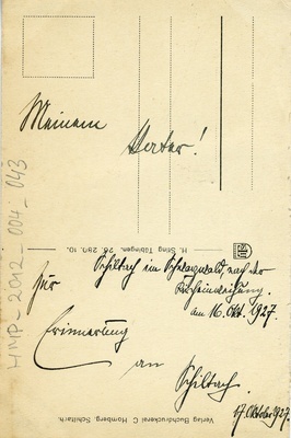 Postkarte vom 17. Oktober 1927. Auf der Vorderseite: Schwarz-weiß Aufnahme von "Schiltach im bad. Schwarzwald / Blick vom Simonskopf talabwärts" sowie handschriftliche Ergänzungen. Auf der Rückseite: handschriftliches Grußwort: "Meinem Vater! Schiltach im Schwarzwald, nach der Kircheinweihung. am 16. Okt. 1927. Zur Erinnerung an Schiltach. 17. Oktober 1927."