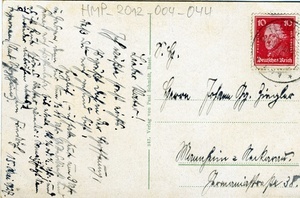 Postkarte vom 15. Mai 1927 mit handschriftlicher Nachricht an Johann Ziegler in Mannheim-Neckarau. Die Vorderseite der Karte zeigt eine kolorierte Ansicht des Baseler Marktplatzes (baseldeutsch "Märtblatz") mit dem Rathaus. Die einzelnen Bauteile des Rathausgebäudes mit seiner markanten roten Sandsteinfassade stammen aus unterschiedlichen Epochen: Das Vorderhaus mit den drei Eingangsarkaden wurde kurz nach 1500 errichtet, die links anschließende "Kanzlei" folgte kurz nach 1600, greift aber nochmals spätgotische Formen auf. Im Zusammenhang mit der Umgestaltung des Marktplatzes von 1898 bis 1904 kamen - nach einem Architektenwettbewerb - rechts der Turm und links der Trakt mit dem Erker dazu. Die Neubauten orientieren sich mit ihrer neogotischen Formensprache an den älteren Gebäudeteilen. Neben den Marktständen sind zwei Trambahnen zu sehen. Bereits 1895 wurde der Platz mit der elektrischen Straßenbahn erschlossen. [Johanna Kätzel]