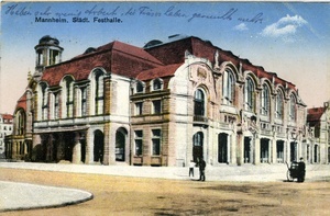 Postkarte vom 12. Juni 1928 an Georg Ziegler in Bad-Rappenau. Auf der Vorderseite: Kolorierte Abbildung des Mannheimer Rosengartens, Aufschrift: "Mannheim. Städt. Festhalle.". Auf der Rückseite: Briefmarke, Poststempel aus Mannheim, Stempel "Nimm dir einen Fernsprechanschluss! Er spart Zeit und Geld", handschriftliches Grußwort.