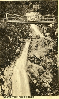 Postkarte vom 27. September 1922 an Georg Ziegler in Mannheim-Neckarau. Auf der Vorderseite: Schwarz-weiß Aufnahme der "Wasserfälle Allerheiligen". Auf der Rückseite: 2 Briefmarken, 2 Poststempel aus Oppenau, handschriftliches Grußwort.