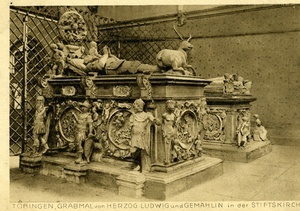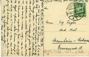 Postkarte vom 1. Dezember 1924 an Fritz Ziegler in Mannheim-Neckarau; Vorderseite: Schwarz-weiß Aufnahme mit der Beschriftung "Tübingen, Grabmal von Herzog Ludwig und Gemahlin in der Stiftskirche"; Rückseite: Briefmarke, Poststempel aus Tübingen, handschriftliches Grußwort.