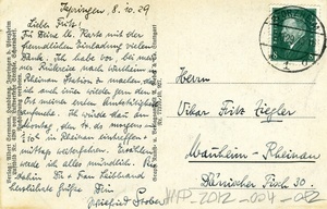Postkarte vom 8. Oktober 1929 an Fritz Ziegler in Mannheim-Neckarau; Vorderseite: Schwarz-weiß Luftaufnahme mit der Beschriftung "Ispringen b. Pforzheim vom Flugzeug aus"; Rückseite: Briefmarke, Poststempel aus Pforzheim, handschriftliches Grußwort.