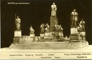 Postkarte vom 2. Oktober 1929 (?) an Fritz Ziegler in Mannheim-Rheinau; Vorderseite: Schwarz-weiß Aufnahme des Lutherdenkmals in Worms mit Beschriftungen der Figuren; Rückseite: Briefmarke, Poststempel, handschriftliches Grußwort.