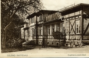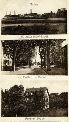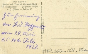 Erinnerungskarte an Bad Rappenau, 29. Mai bis 10. Juli 1928; Vorderseite: Schwarz-weiß Abbildung der Pension und Brauerei Jakob Häffner in Bad Rappenau; Rückseite: Aufdruck: "Bad Rappenau / Pension und Brauerei, Gartenwirtschaft / 30 Fremdenzimmer - Fließendes Wasser / v. J. Häffner - Telefon 23", handschriftlicher Text.