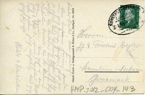 Postkarte vom 15. August 1929 (?) an Georg und Friedrich Ziegler in Mannheim-Neckarau. Auf der Vorderseite: Schwarz-weiß Abbildung der Donauquelle in Donaueschingen. Auf der Rückseite: Briefmarke, Poststempel aus Konstanz, handschriftliches Grußwort.