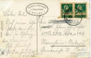 Postkarte an Johann Georg Ziegler in Mannheim-Neckarau aus dem Jahr 1919 (?). Auf der Vorderseite: Kolorierte Ansicht von "Pfannenstiel - Okenshöhe (802 m) / Blick auf Glarneralpen" und "Wirtschaft z. Pfannenstiel". Auf der Rückseite: 2 Briefmarken, Poststempel aus Zürich, handschriftliches Grußwort.