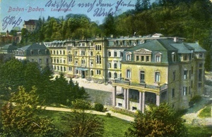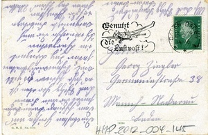 Postkarte vom 13. Mai 1929 an Georg Ziegler in Mannheim-Neckarau; Vorderseite: Kolorierte Abbildung des Landesbads in Baden Baden, handschriftliche Beschreibung; Rückseite: Briefmarke, Poststempel aus Baden-Baden, Stempel "Benutzt die Luftpost", handschriftliches Grußwort.