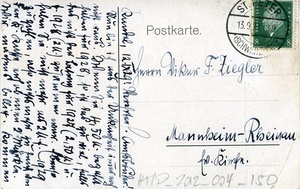 Postkarte vom 12. September 1929 an Friedrich Ziegler in Mannheim-Rheinau. Auf der Vorderseite eine farbige Zeichnung einer Ortschaft mit Kirche. Auf der Rückseite: Briefmarke, Poststempel von St. Peter, handschriftliches Grußwort.
