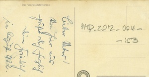Ungelaufene Postkarte. Auf der Vorderseite ist eine kolorierte Abbildung des Vierwaldstättersees mit Beschriftungen. Die Namen der Städte und Berge sind markiert. Auf der Rückseite ist ein handschriftliches Grußwort.
